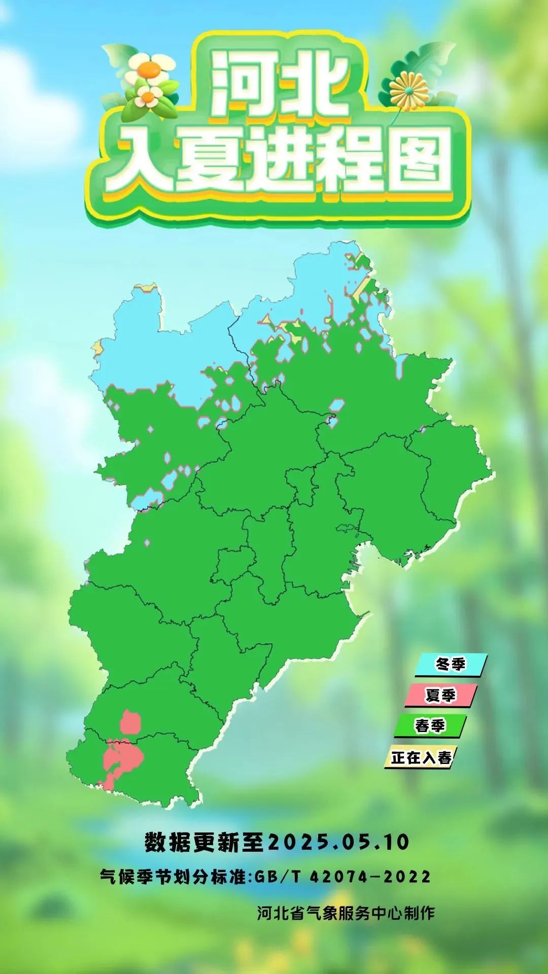 截至5月10日,邢台、邯郸局地已经迈进了夏日的门槛,张家口、承德部分地区仍在冬季或正在入春,别的地方则为春季。